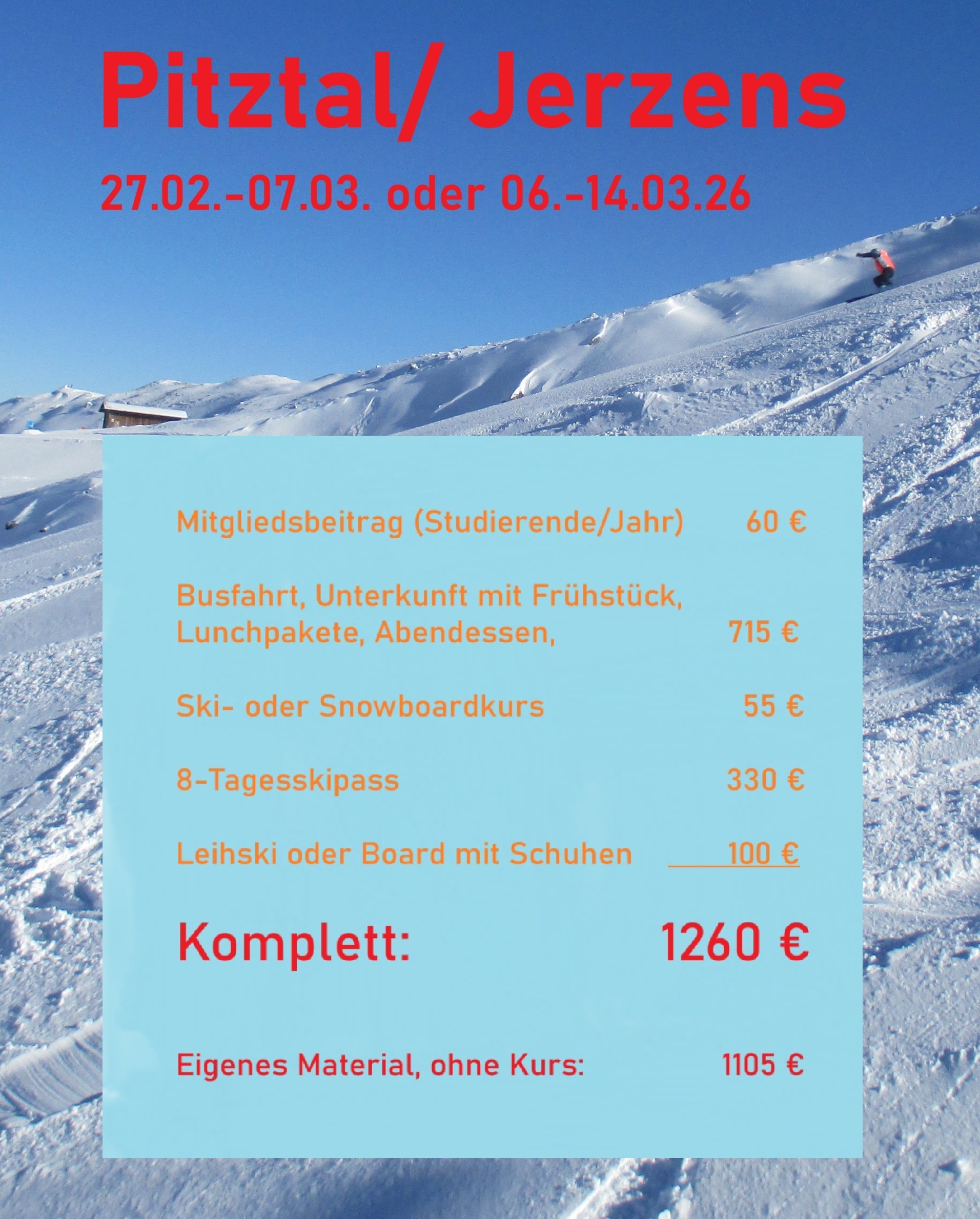 Maximaler Skispaß in der Gruppe zum minimalen Preis: Mit unserer Mitgliedschaft, Leihmaterial und Skipass kosten acht Skitage im Pitztal nur 1260 Euro. Dabei handelt es sich um eines der höchstgelegenen Skigebiete Tirols. Lunchpakete sind inklusive, Getränke oder sonstigen Reisebedarf könnt Ihr günstig im Supermarkt kaufen. Wer eigenes Material im Reisebus mitnimmt, spart etwa 100 € Leihgebühren im Skigebiet. Ohne Ski-oder Snowboardkurs wird es noch einmal etwas günstiger. Für 1105 € habt Ihr dann ansonsten wirklich fast alles inklusive: